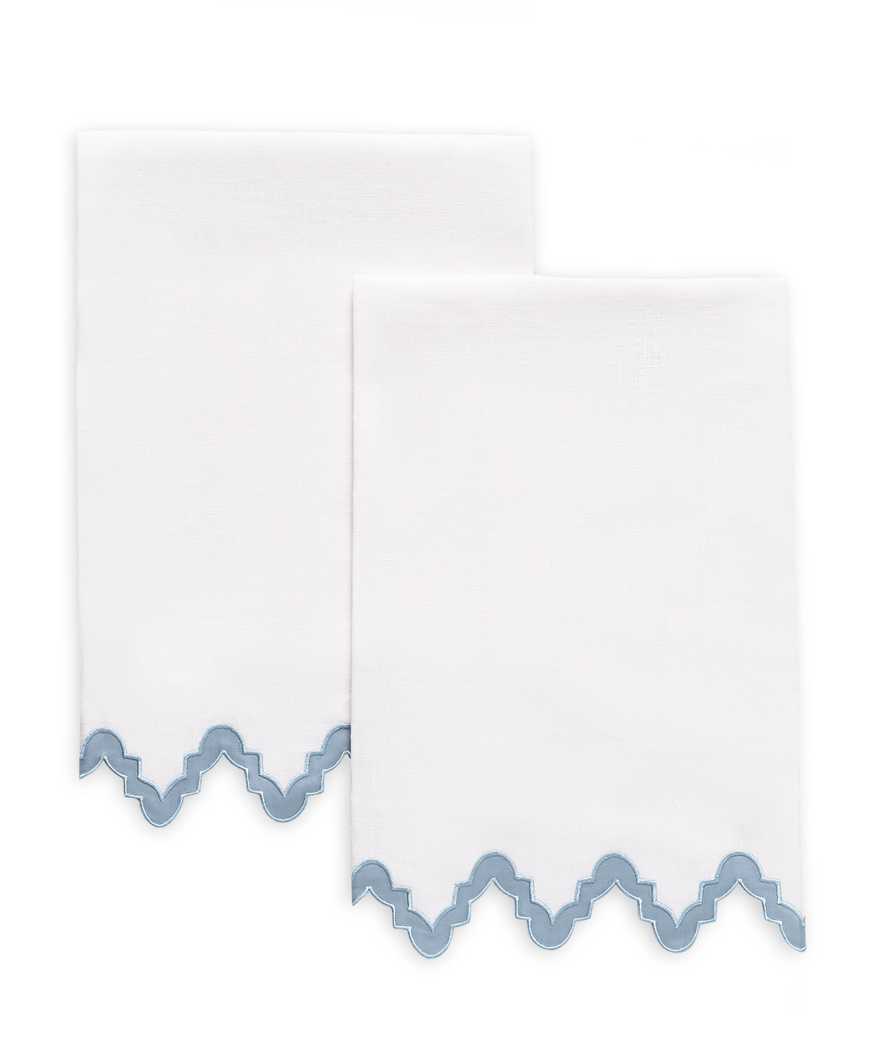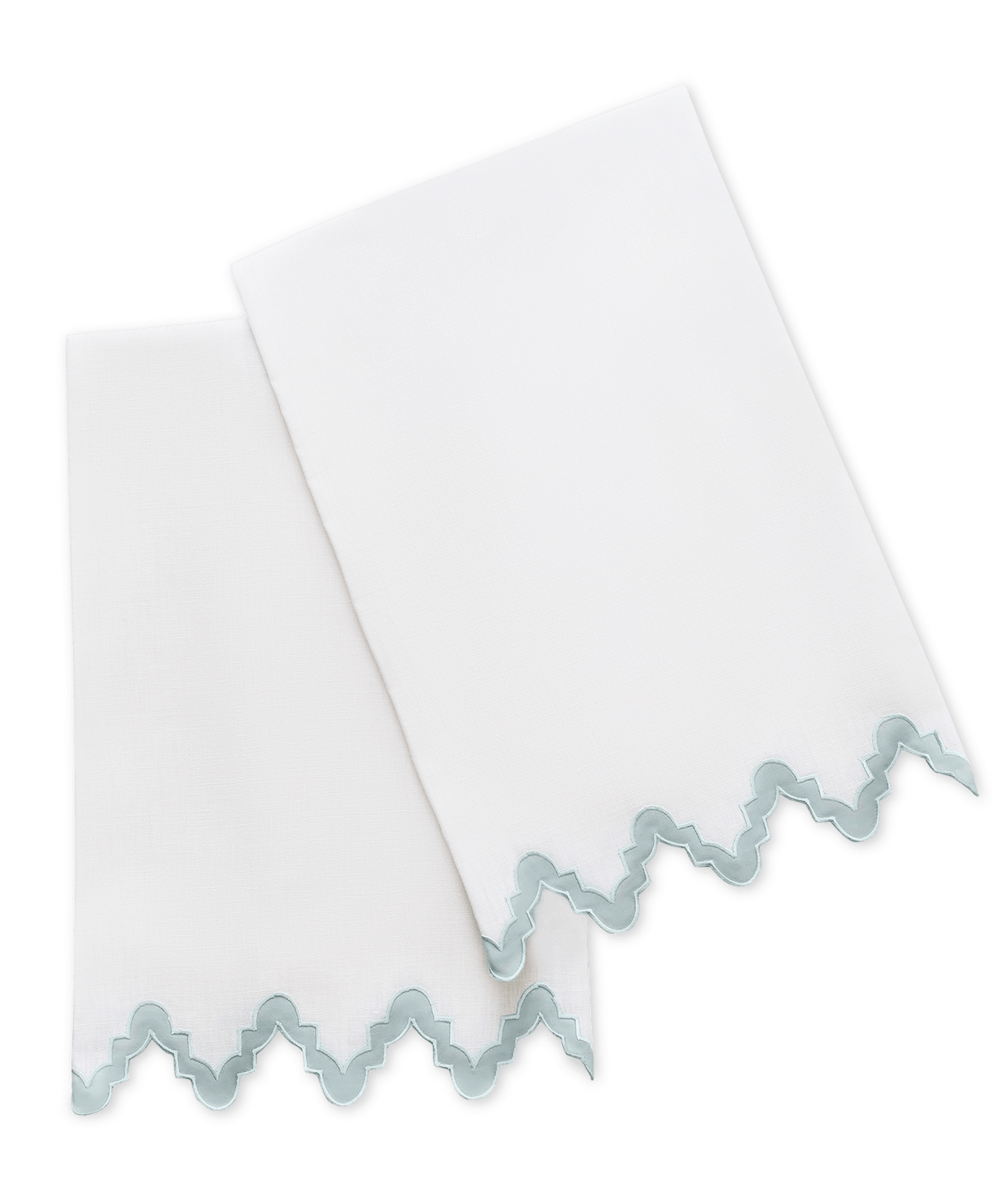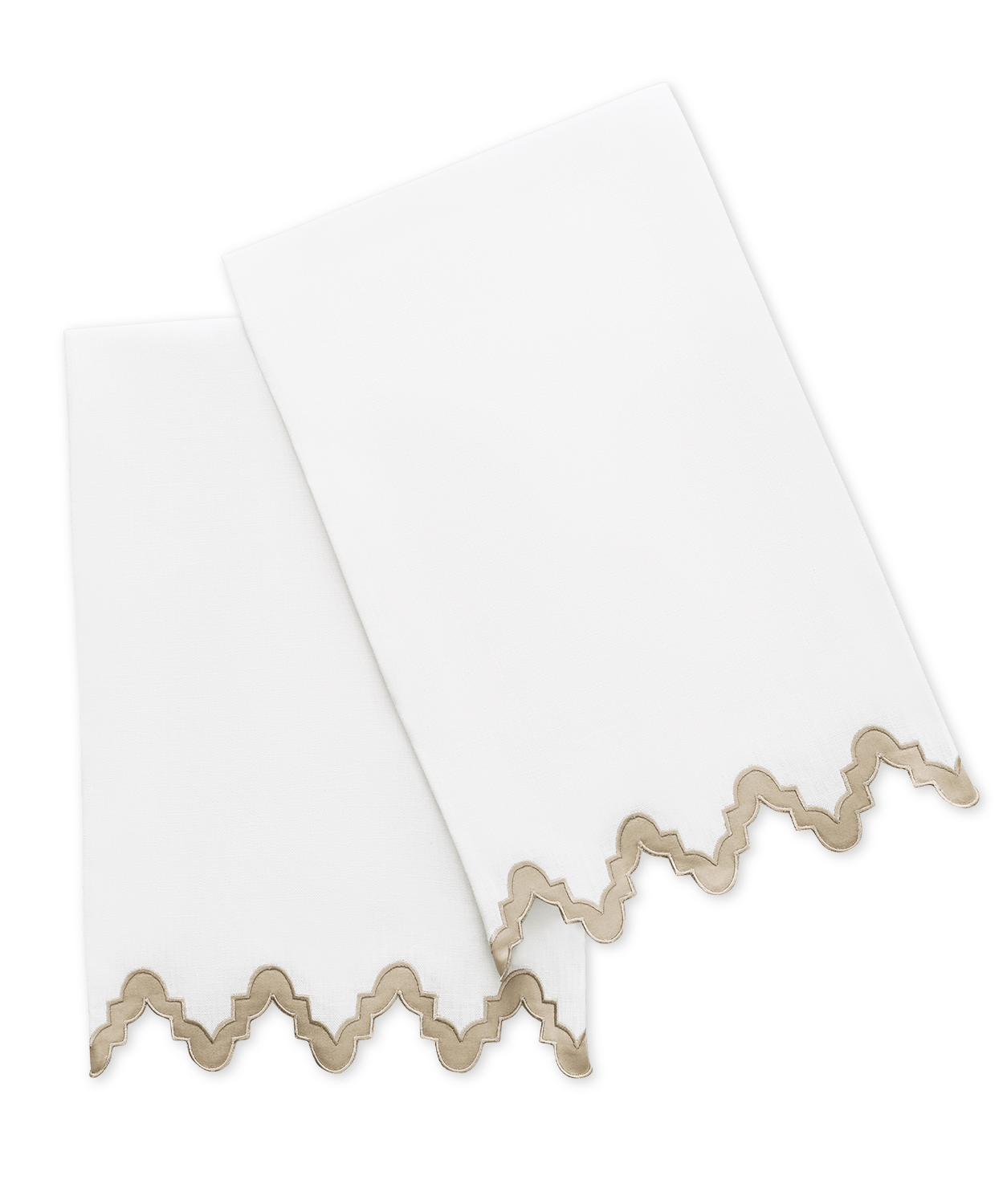 Drawing from the graceful aesthetics of Palm Beach's most coveted destinations, the Aziza guest towels present an exquisite arch trim rendered in Nocturne sateen. This distinctive detail captures the architectural elegance of high-end boutique facades, delivering a touch of refined sophistication to your guest bath.