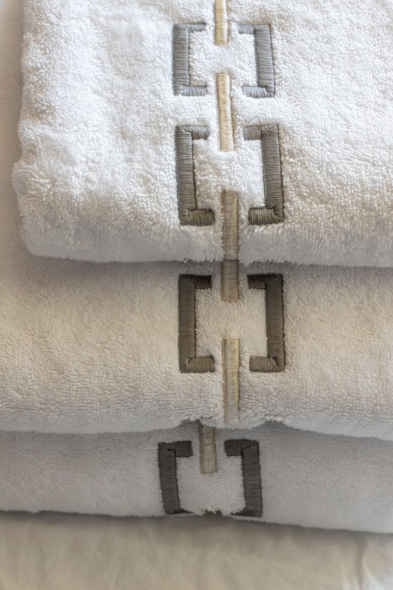 Transform your daily routine with Geometric Towels from Pioneer Linens Signature Collections. These luxurious towels showcase intricate geometric embroidery in a refined palette, accented with subtle white shadow detailing. Perfect for those who appreciate understated sophistication and enduring quality in their home essentials.