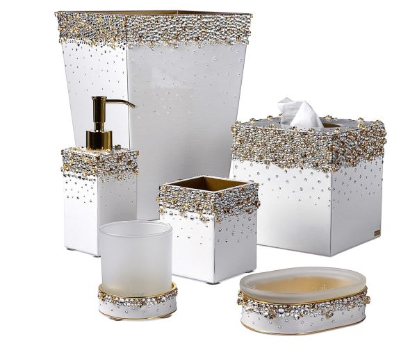 A signature collection of Mike + Ally workmanship. Cascading Austrian crystals on a jet black enamel background w/gold accents creates drama in the bathroom sanctuary.