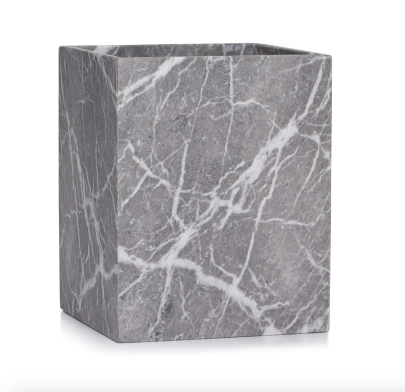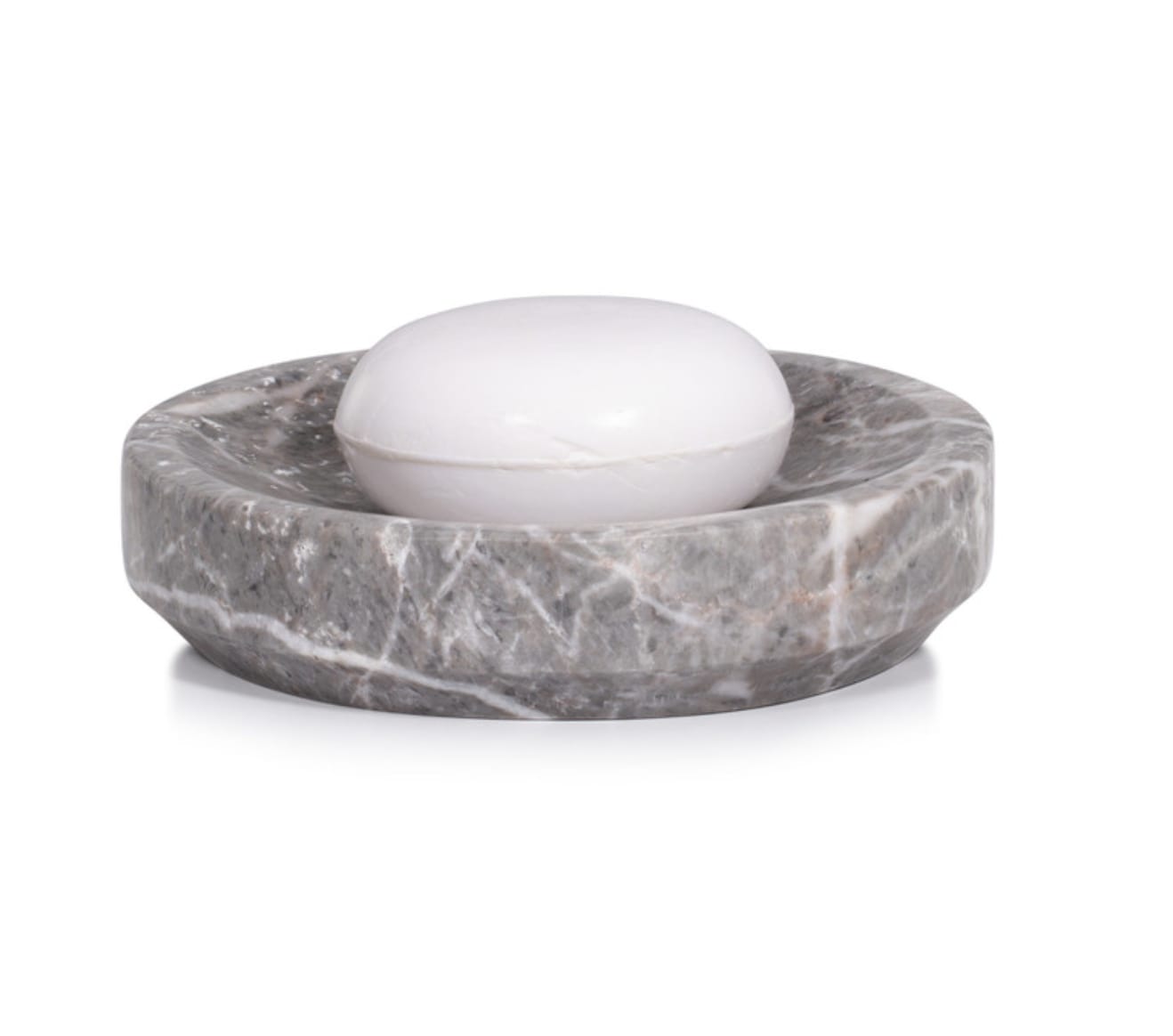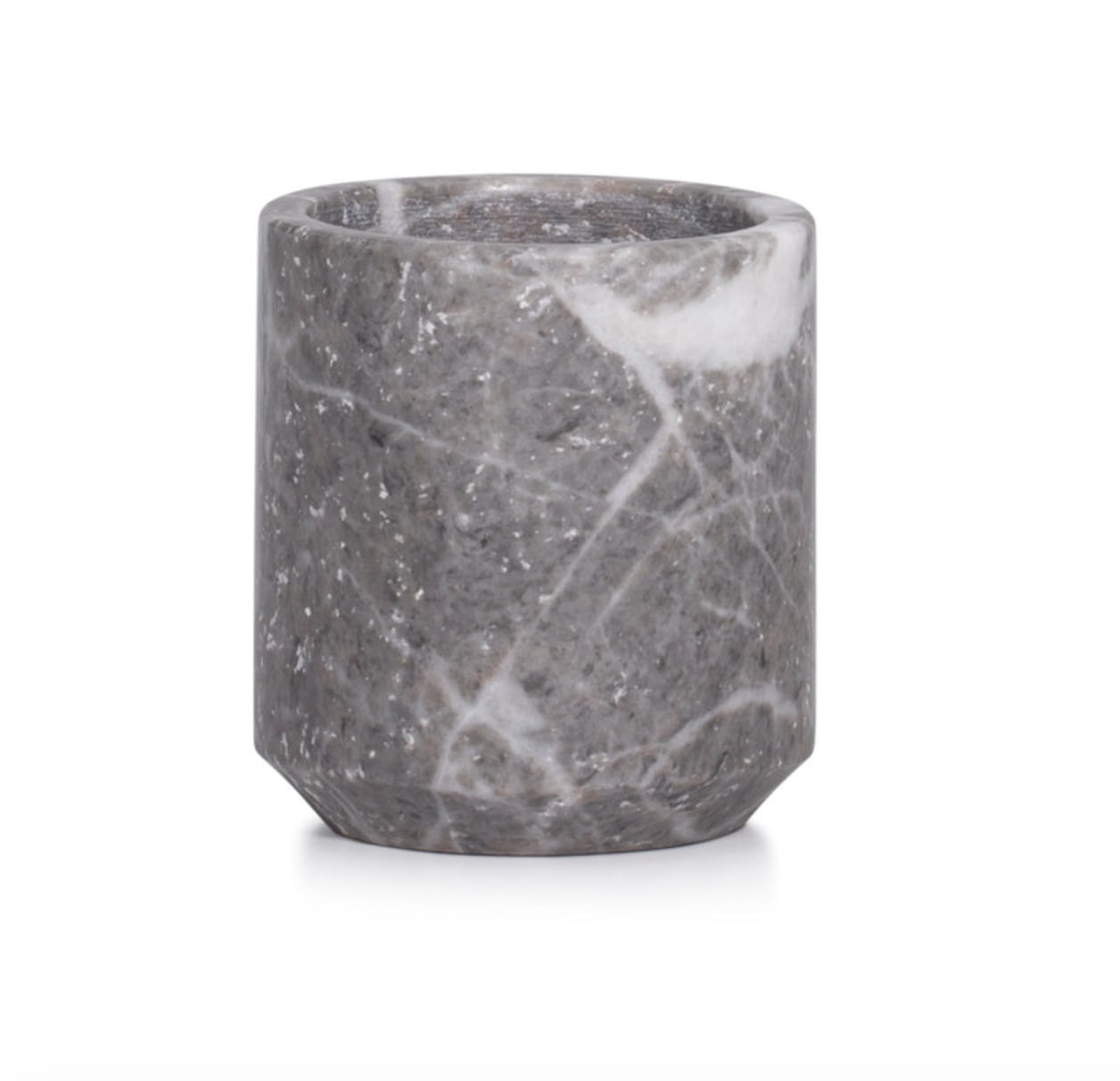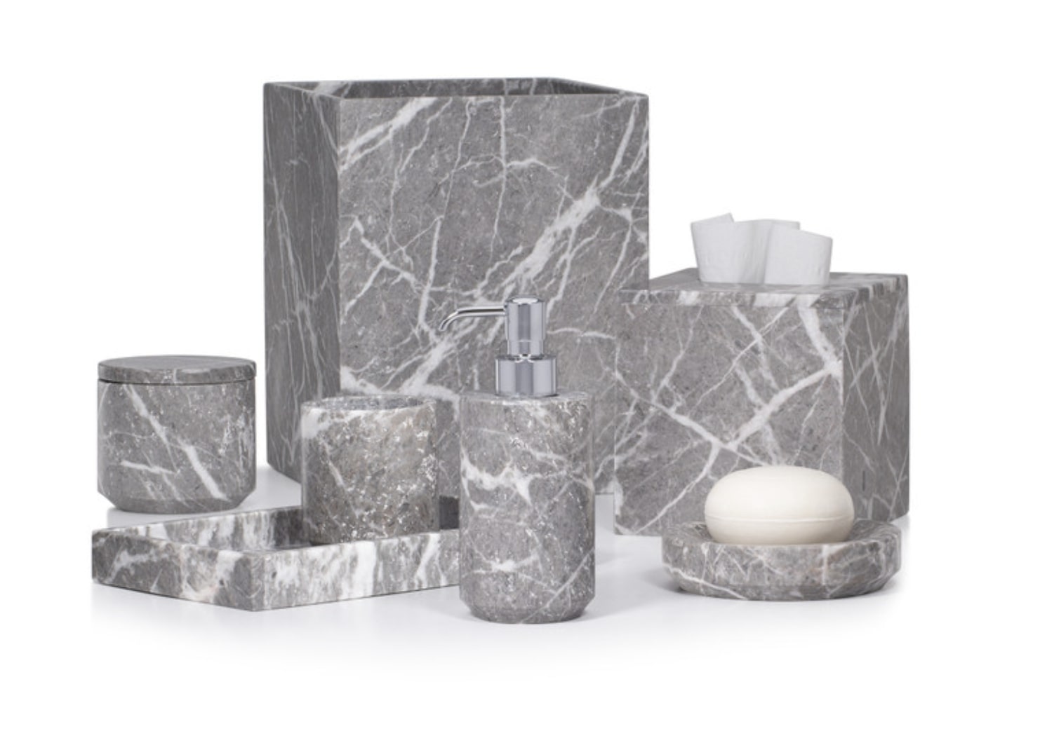 This gray stone bath accessory collection is handcrafted in finely honed marble. Natural colors and patterns make each piece unique.