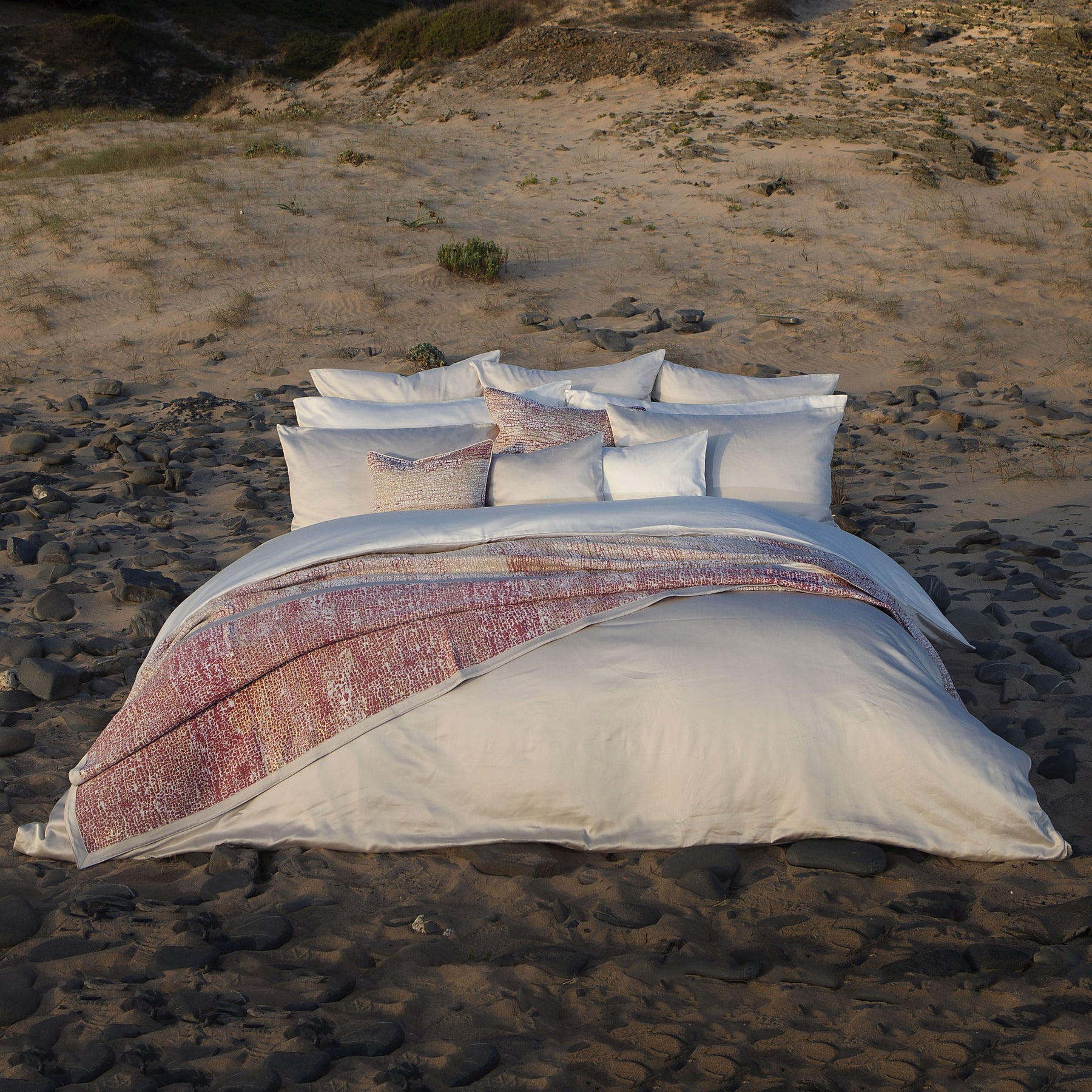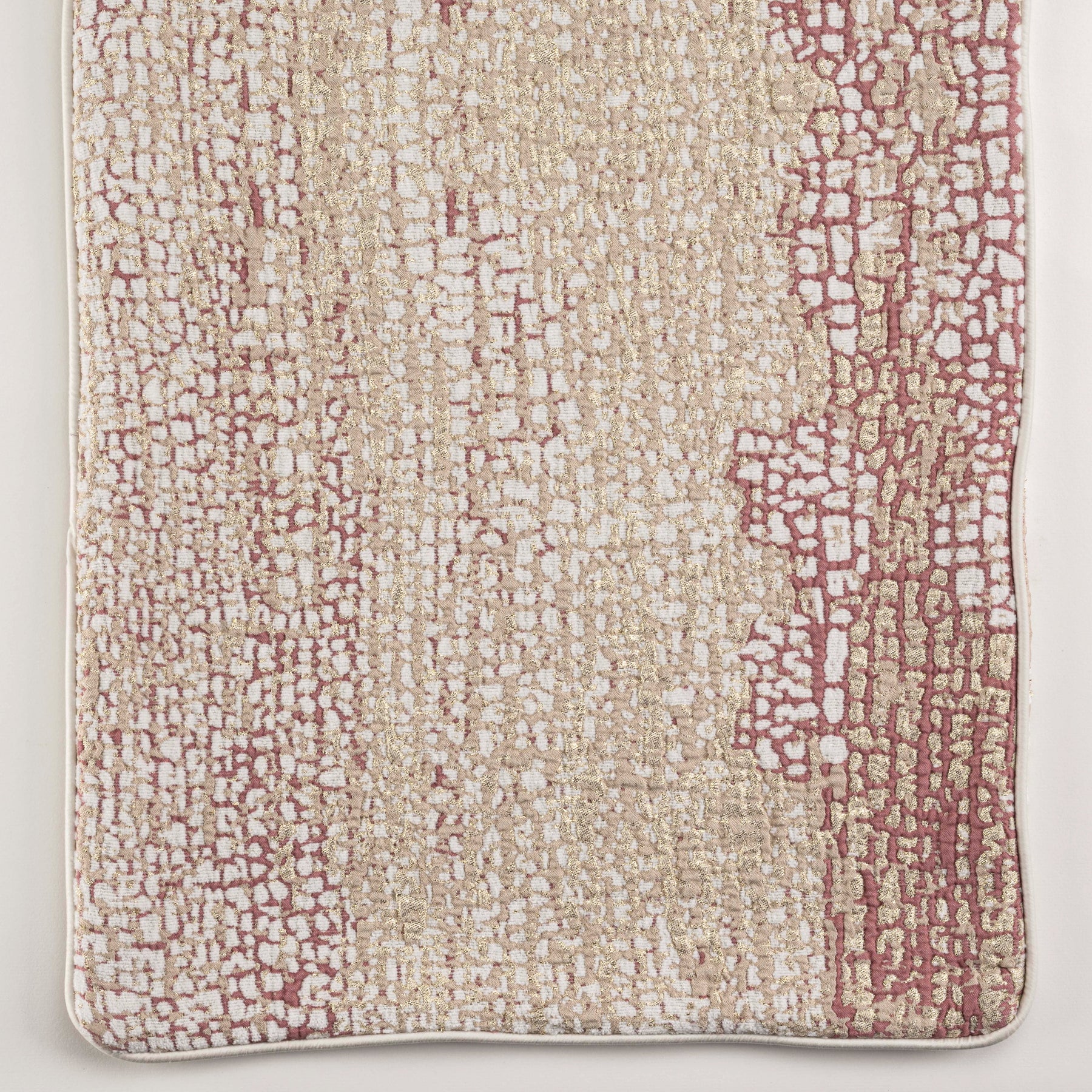 Expertly woven in chenille, the Lems Bed Coverlet features a captivating fusion of cherry pink, ecru, and golden threads. Its design evokes the delicate motifs seen in Raku ceramics and the textured surface of a parched ocean bed. Drawing inspiration from the enduring charm of velvet, Lems highlights the fabric’s sumptuous texture and radiant glow. The plush feel and shimmering surface of each coverlet offer a luxurious experience, embodying elegance and comfort that transcend time.