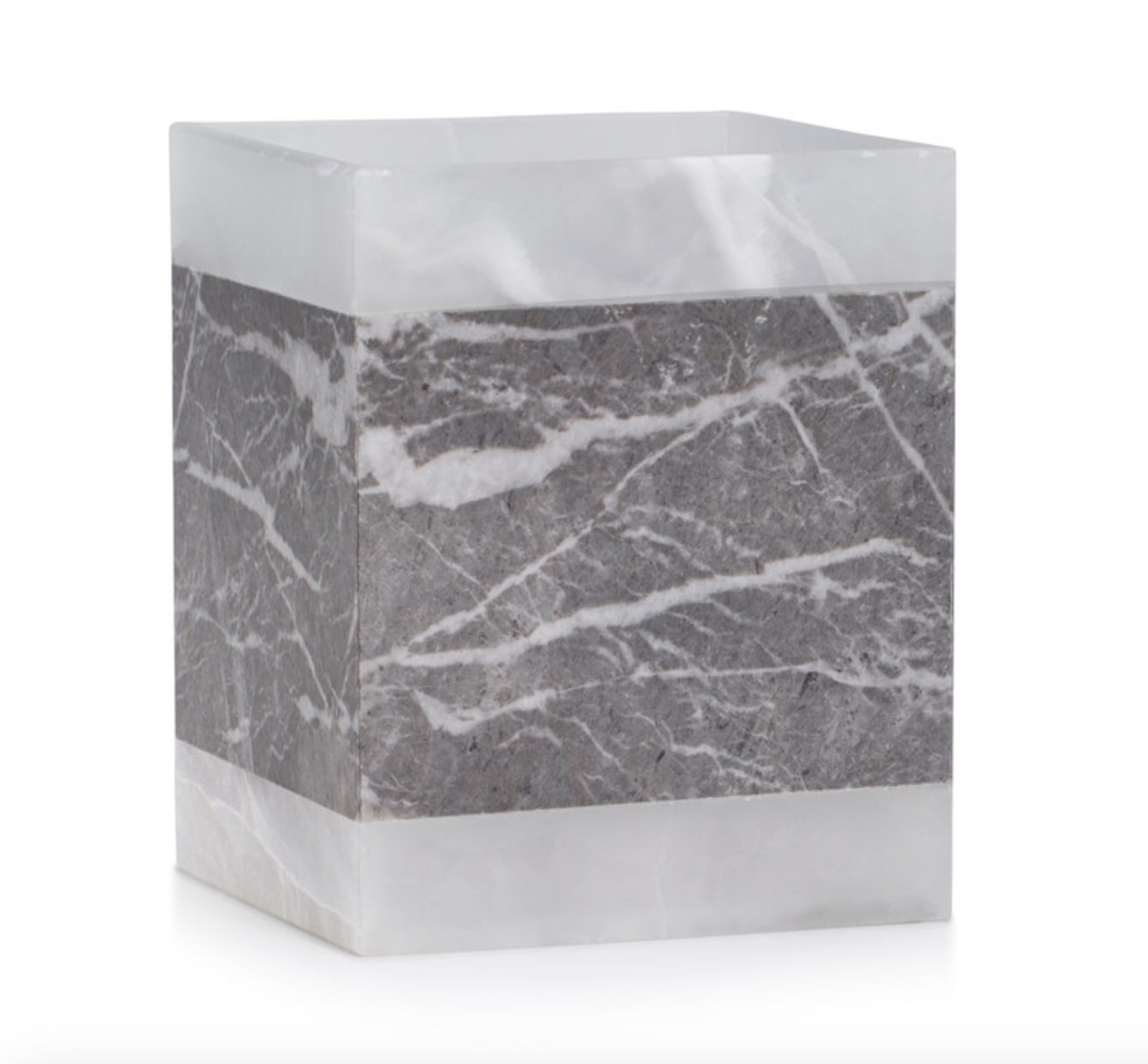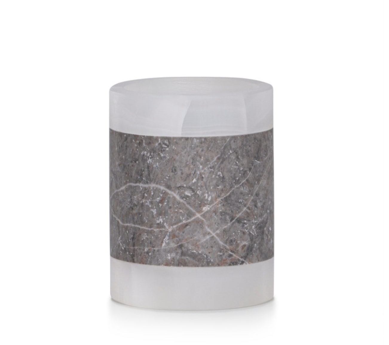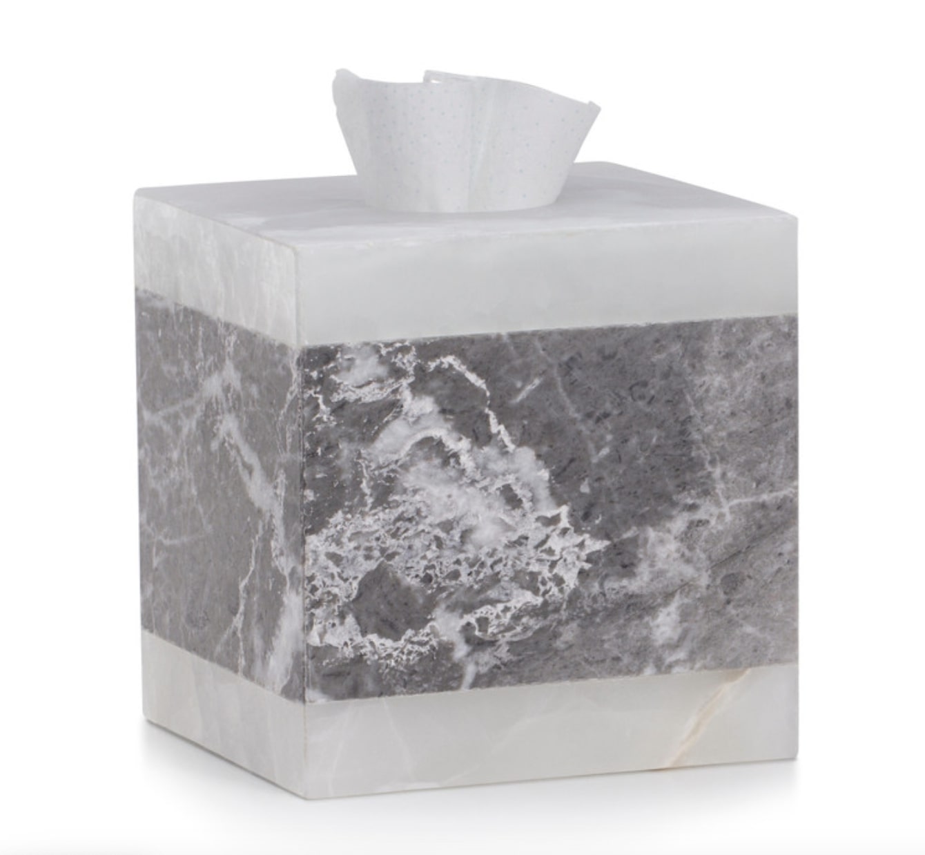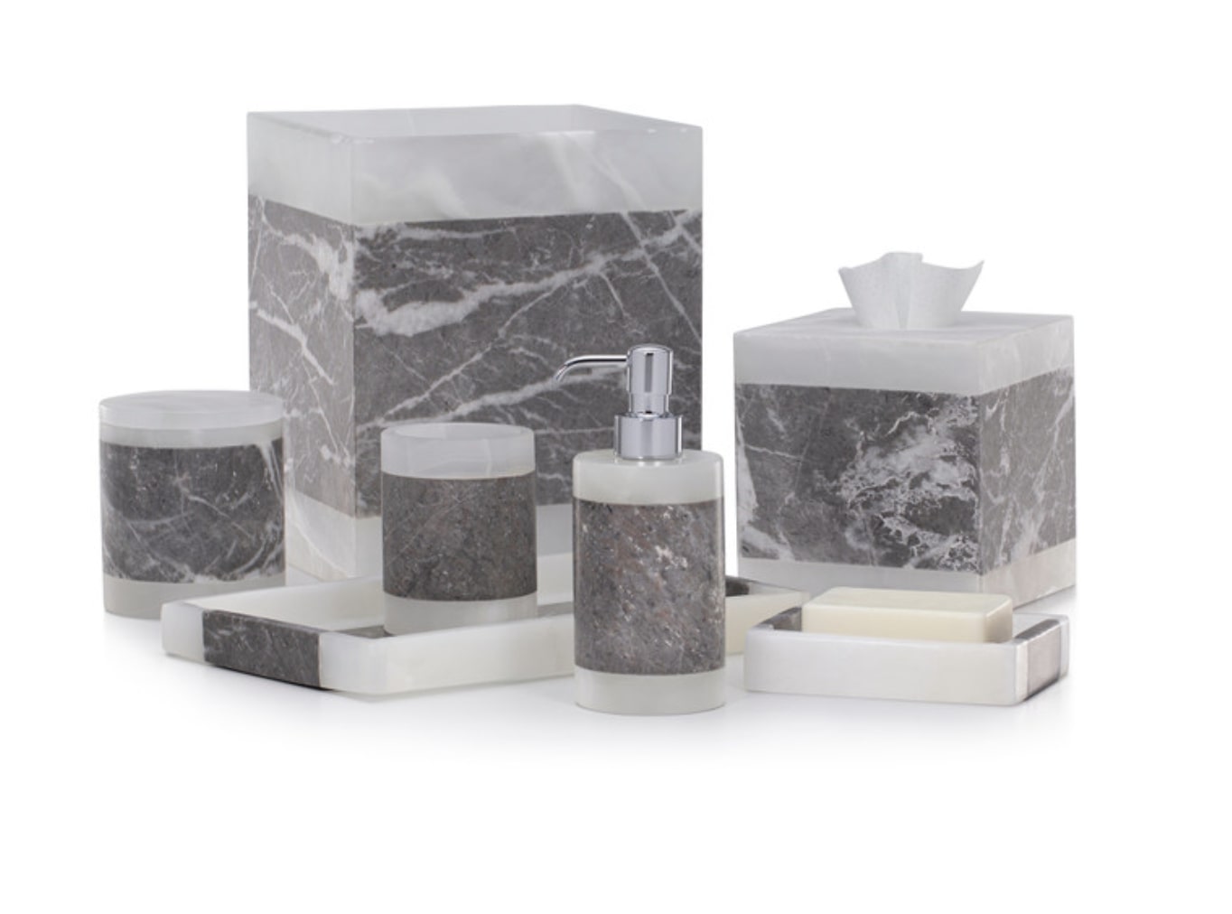 Featuring a striking composition of luminous white onyx and sophisticated gray marble, this vanity set delivers refined elegance to your bathroom sanctuary. Bold marble bands create dramatic visual interest against the pristine white onyx base, while a luxuriously honed satin finish enhances the stone's natural depth. Every piece is entirely singular, distinguished by the organic veining and mineral formations inherent to natural stone. Expertly crafted in Mexico, this collection represents the pinnacle of timeless design and enduring quality.