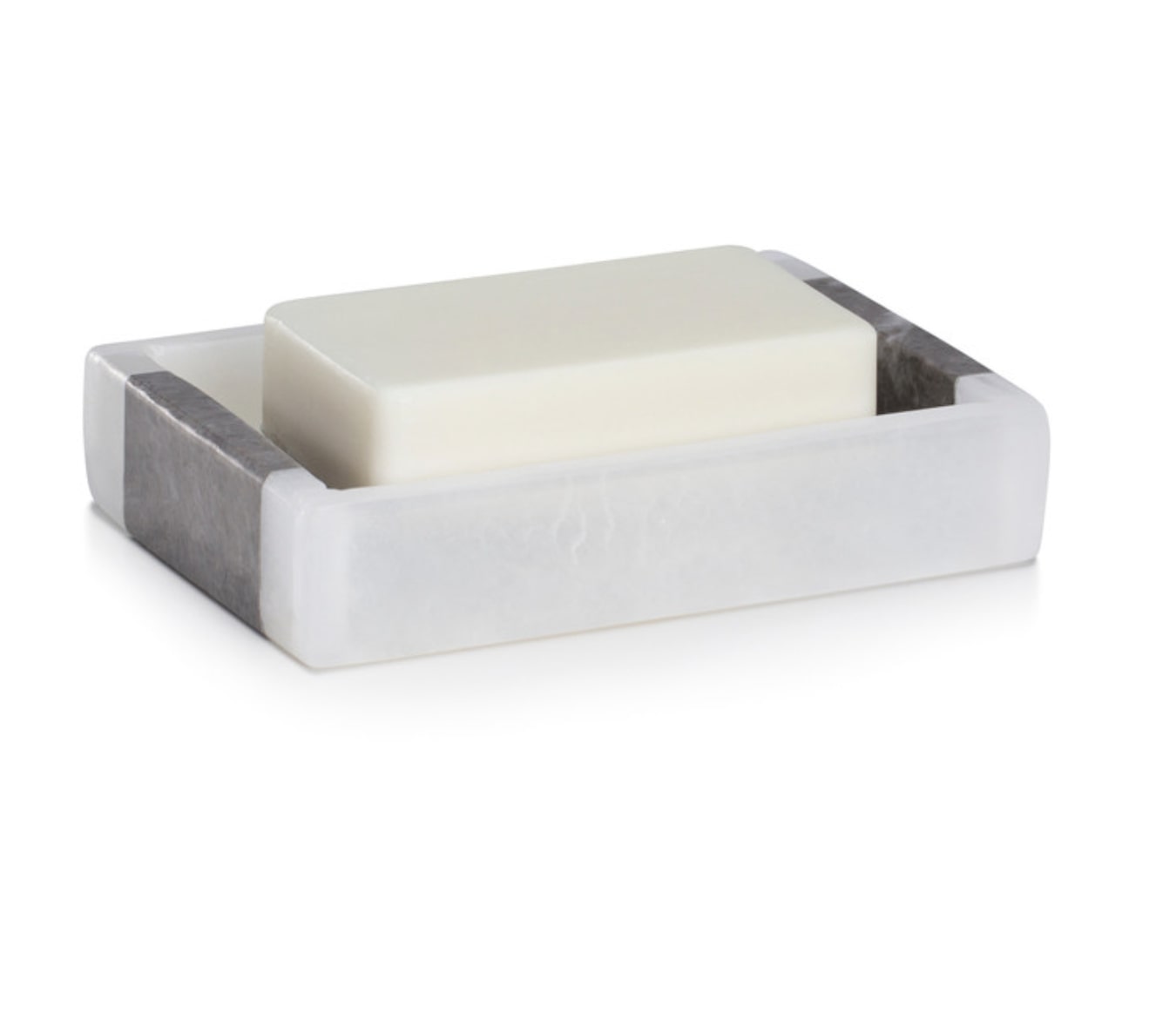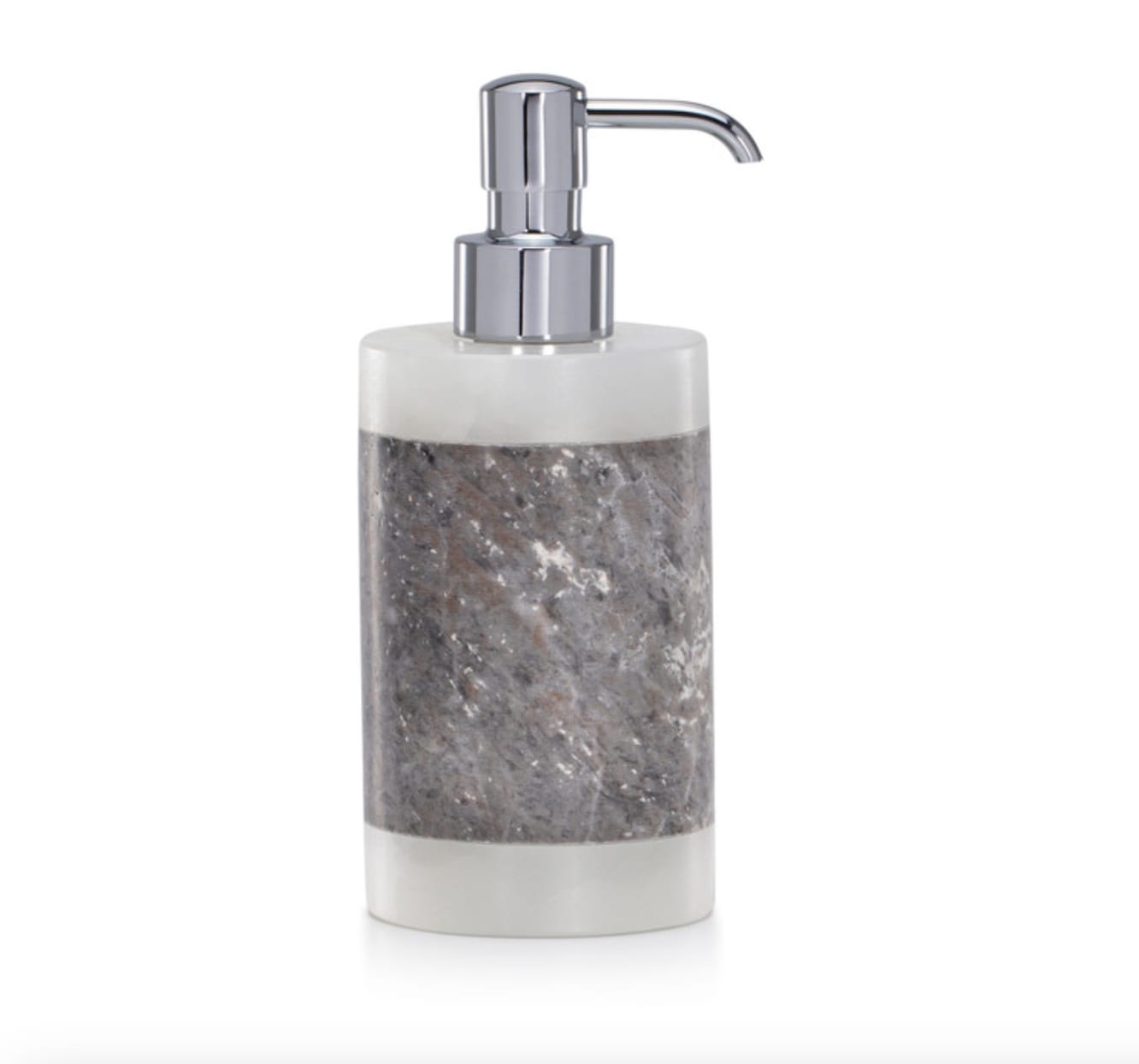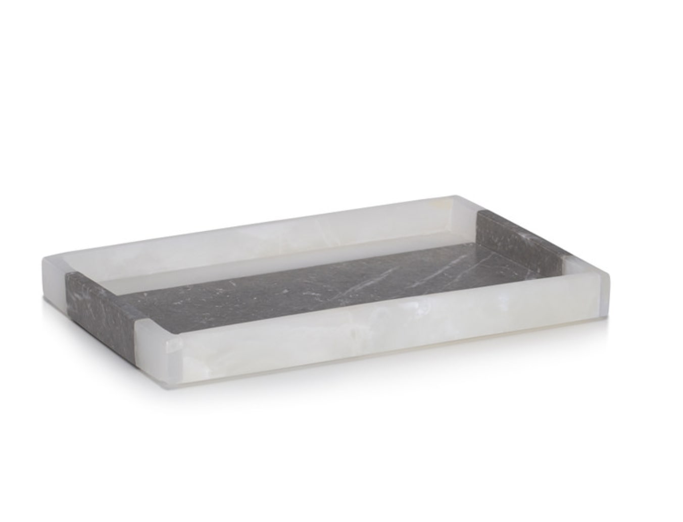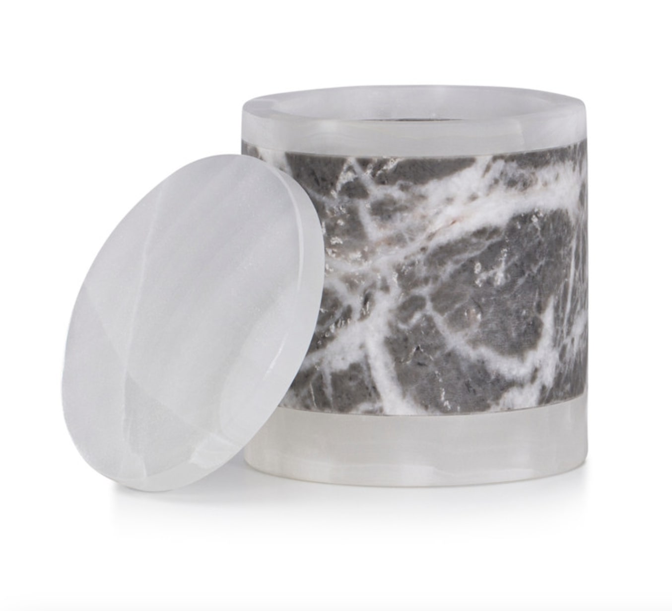 Featuring a striking composition of luminous white onyx and sophisticated gray marble, this vanity set delivers refined elegance to your bathroom sanctuary. Bold marble bands create dramatic visual interest against the pristine white onyx base, while a luxuriously honed satin finish enhances the stone's natural depth. Every piece is entirely singular, distinguished by the organic veining and mineral formations inherent to natural stone. Expertly crafted in Mexico, this collection represents the pinnacle of timeless design and enduring quality.