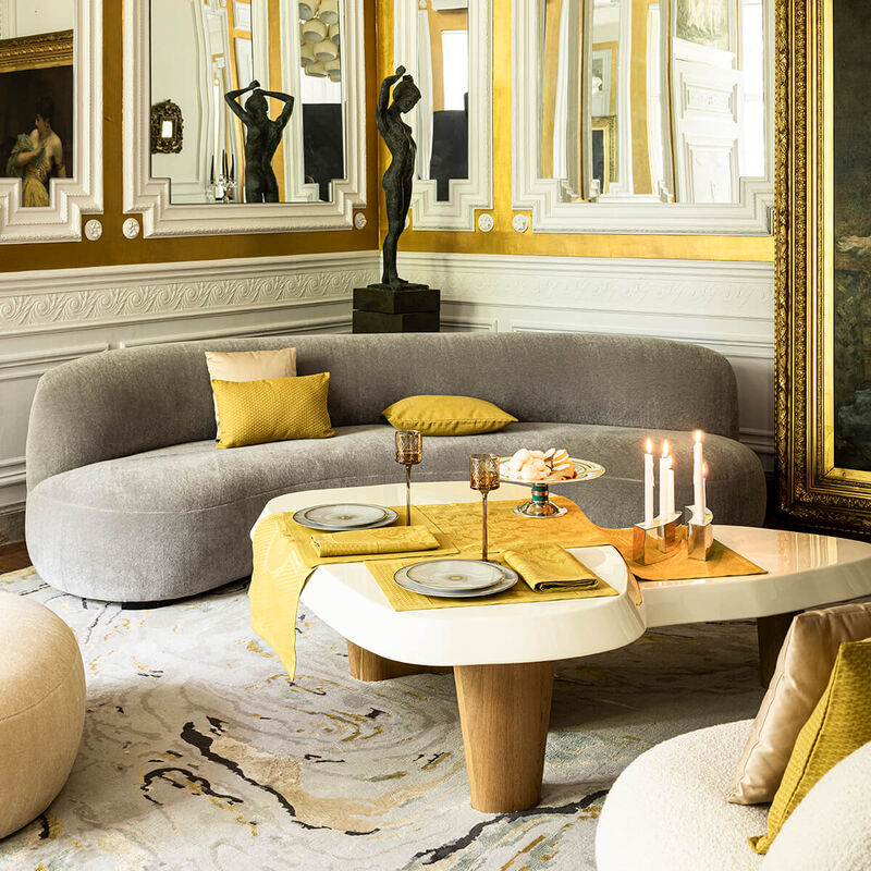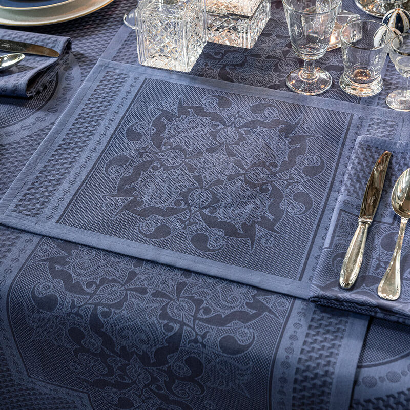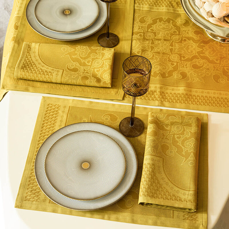 Explore the elegance of Venice's palaces with Palais Vénitien table linens by Le Jacquard Francais. Featuring baroque arabesques and geometric patterns, these linens bring the refined beauty of Italian design to your dining experience.