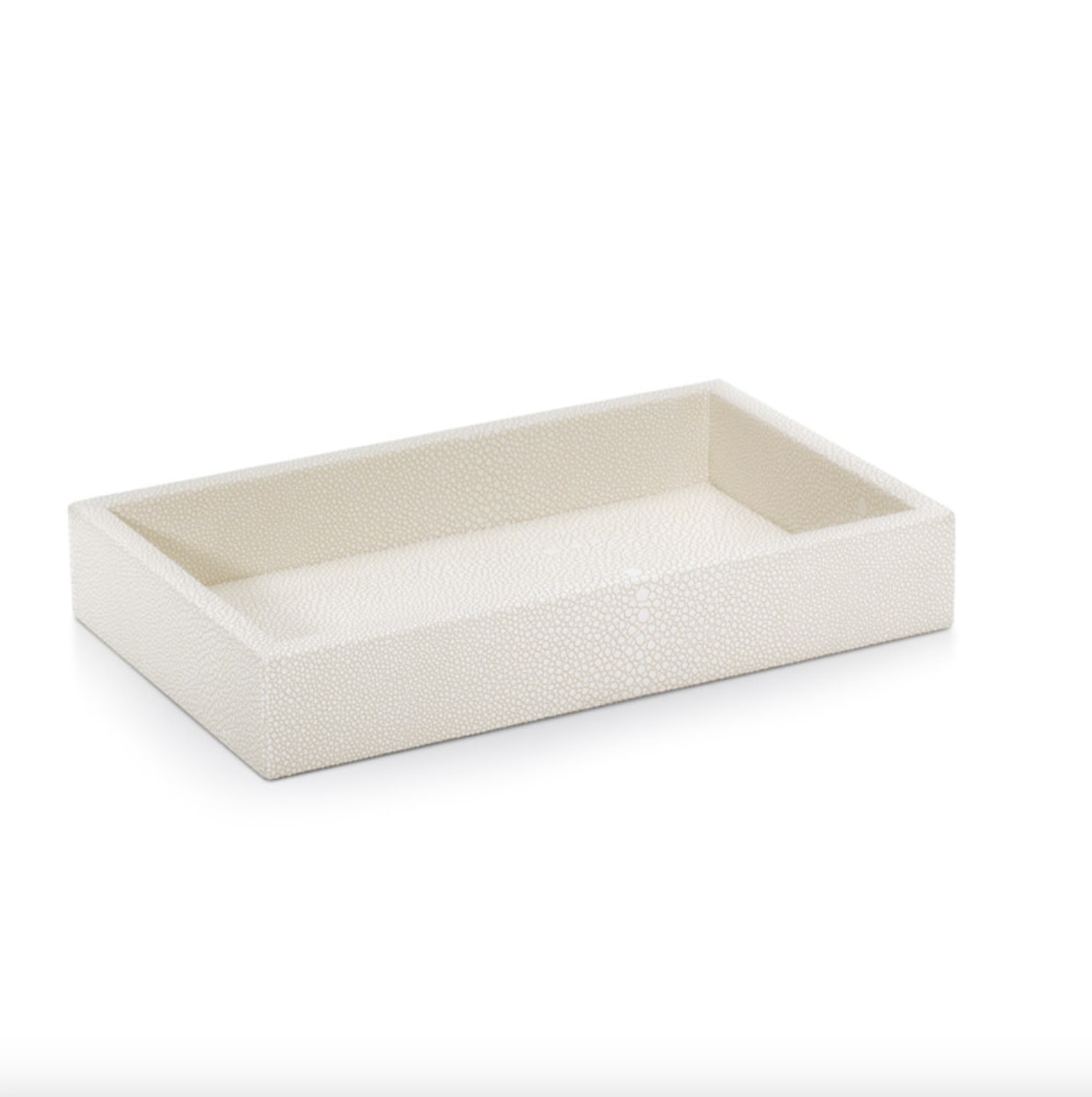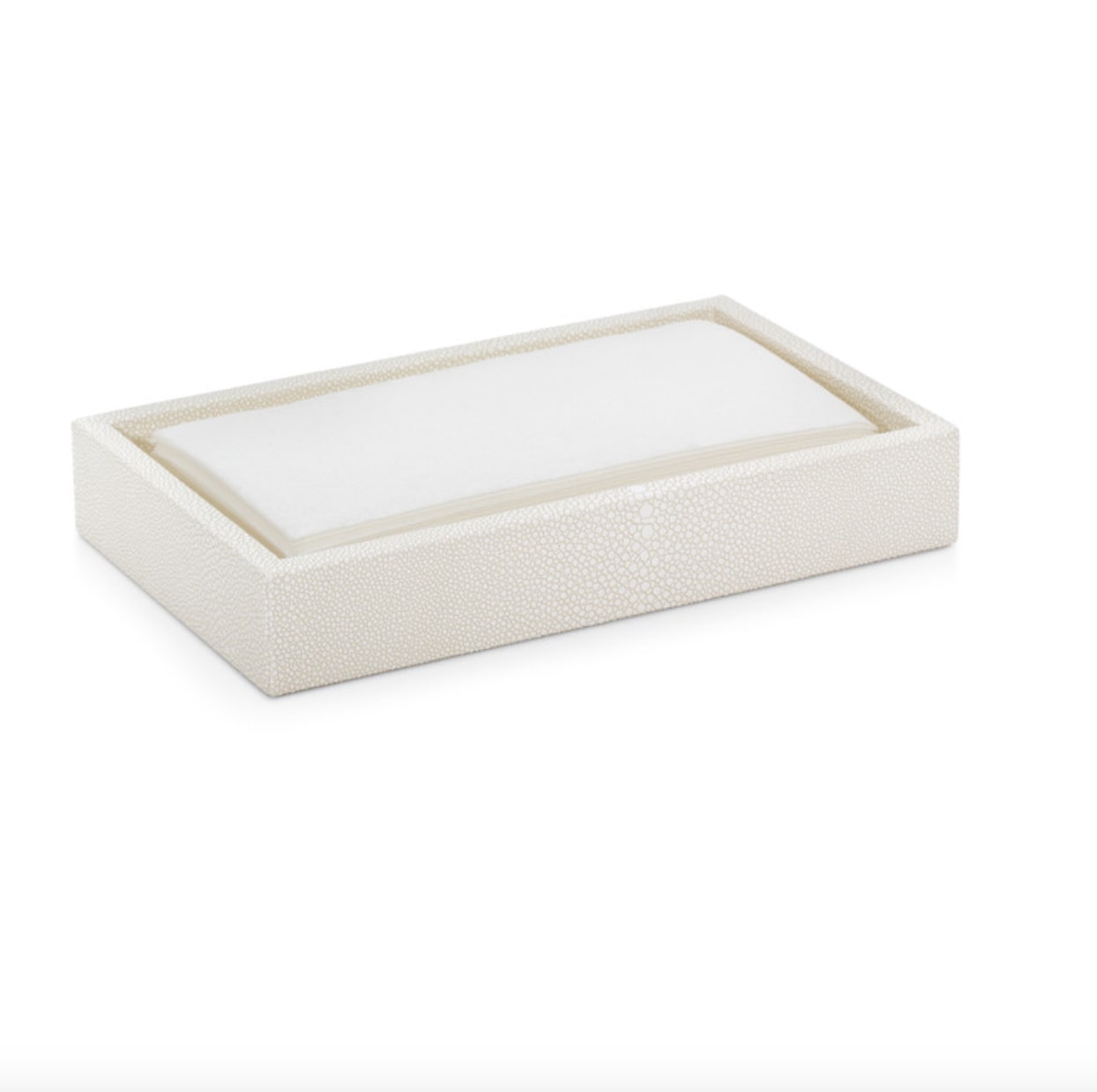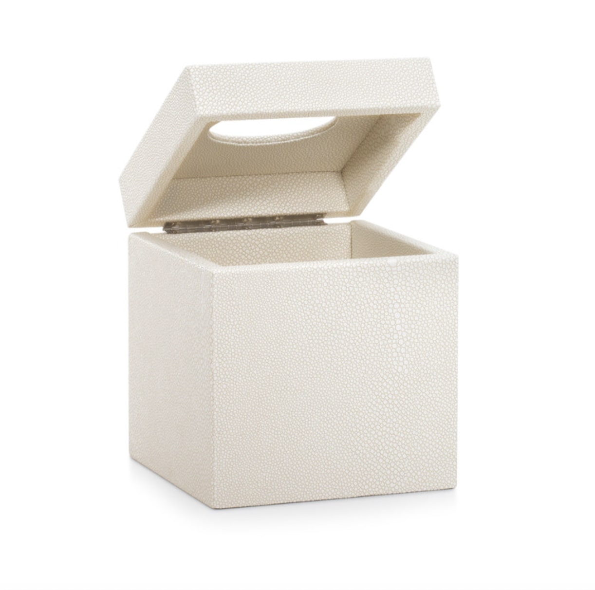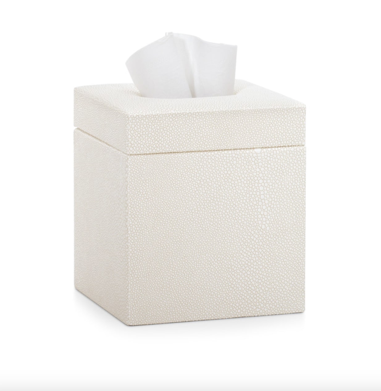 View more informationThis versatile ivory waste basket, tissue box cover and tray features the timeless shagreen pattern, embossed on easy-care leatherette. The tissue cover is a beautifully constructed box with a hinged lid.