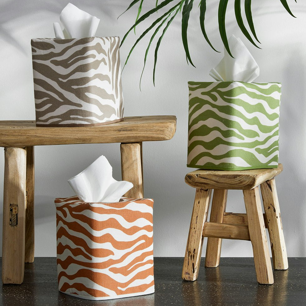 Matouk's Regine tissue box cover merges artistic design with everyday practicality through an exquisite jacquard weave inspired by Schumacher's most dynamic patterns. Crafted from a luxurious linen-cotton blend with a sumptuous feel, this piece showcases an elegant zebra pattern that commands attention as décor while remaining entirely functional for daily living. A testament to refined craftsmanship and timeless style.