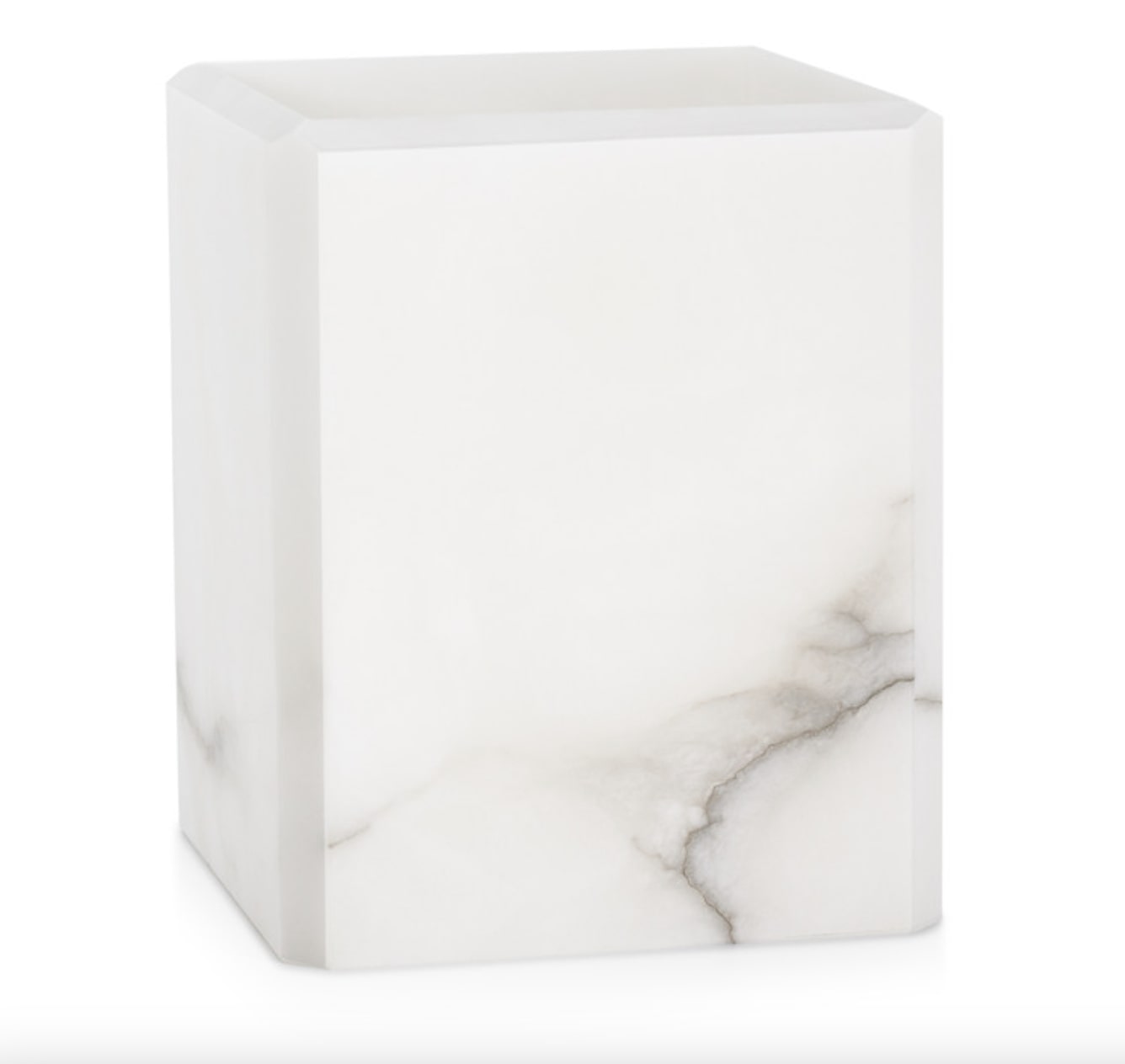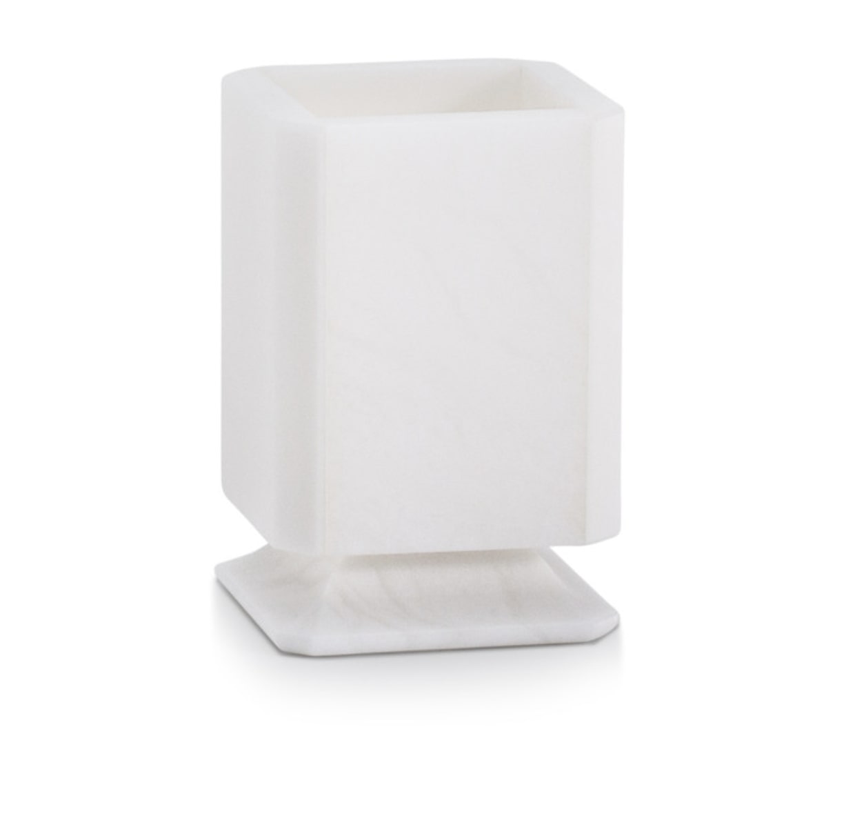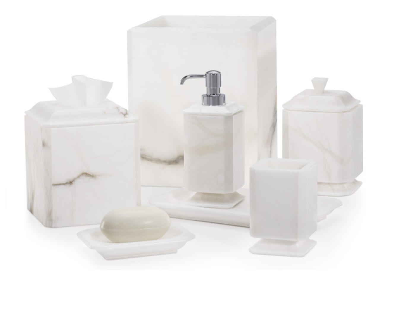Crafted from exquisite Italian alabaster, this distinguished bath collection showcases the natural elegance of luminous white stone. Each piece reveals its own distinctive character through delicate internal patterns visible beneath the surface, while precisely beveled edges impart a refined, sculptural presence. A sophisticated addition to any luxury bathroom.