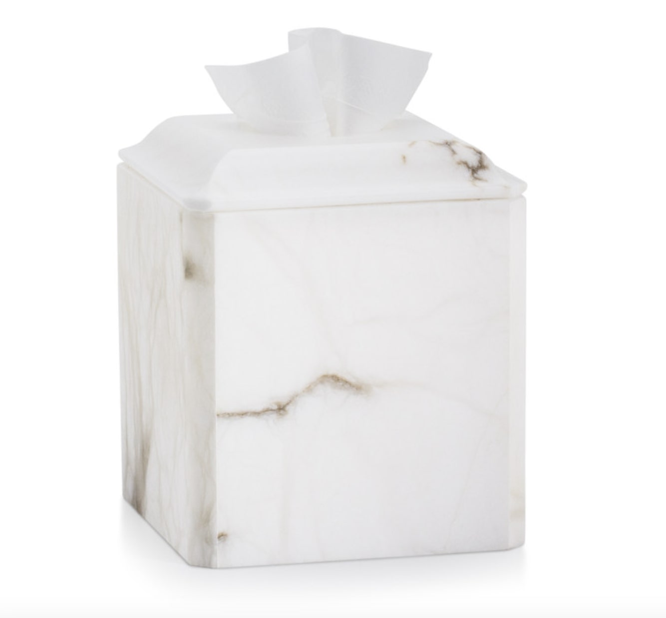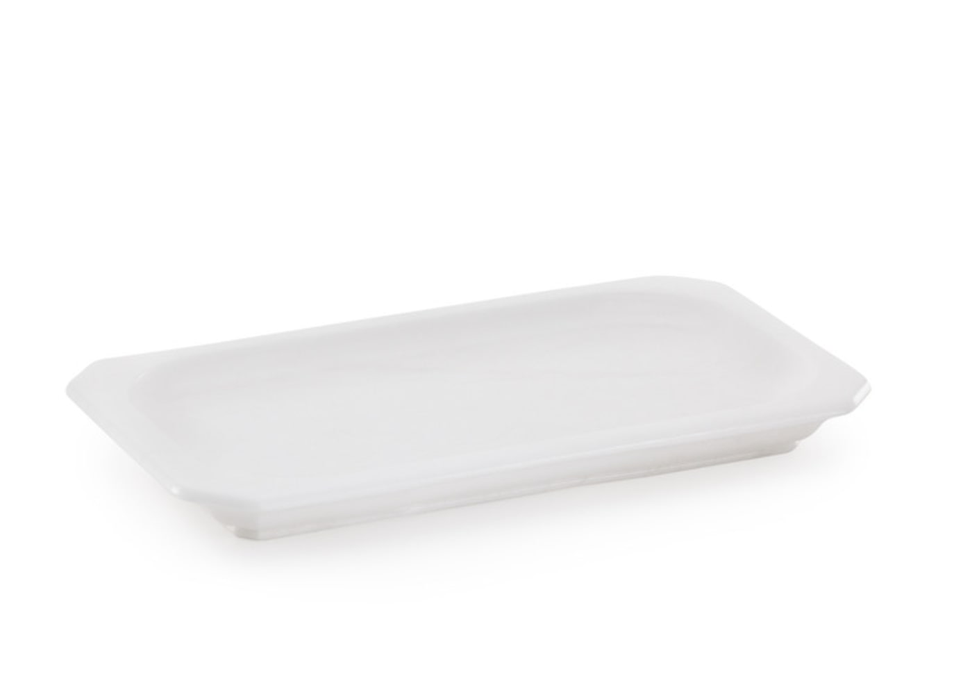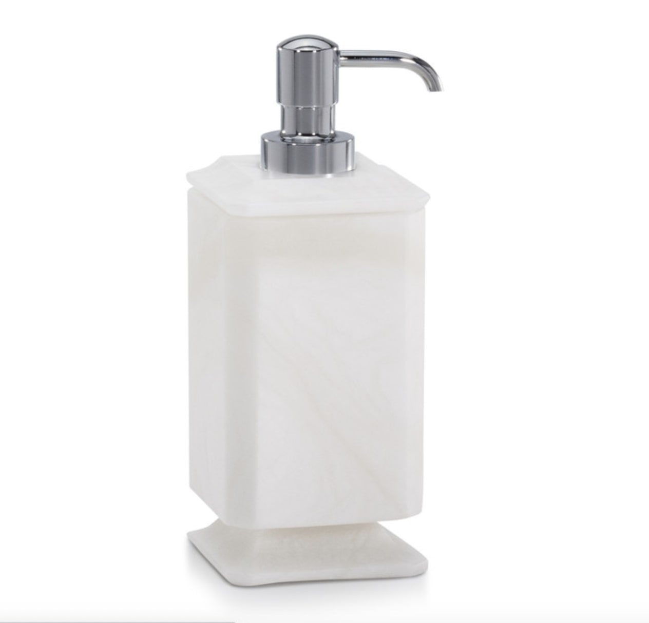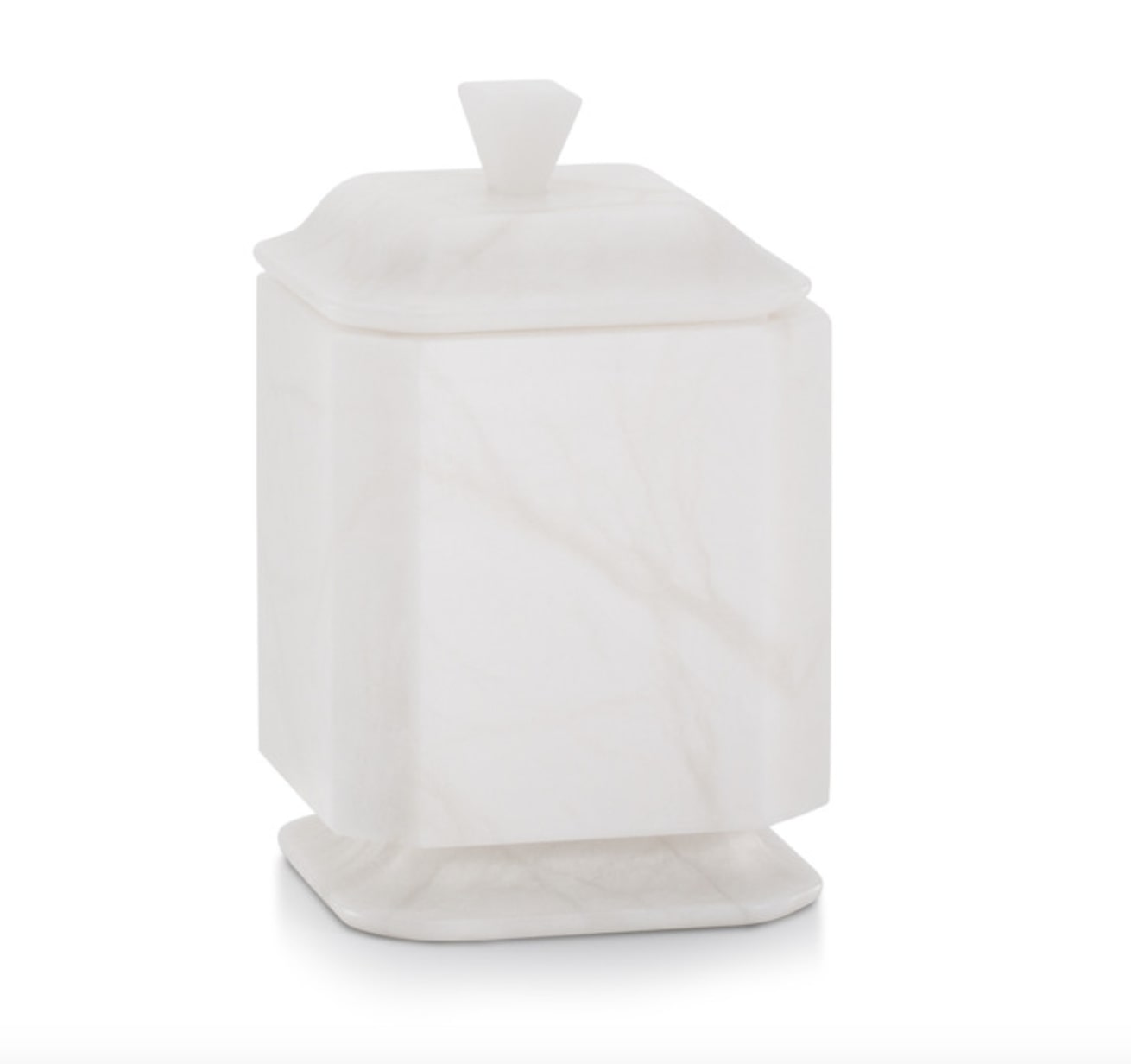 Crafted from exquisite Italian alabaster, this distinguished bath collection showcases the natural elegance of luminous white stone. Each piece reveals its own distinctive character through delicate internal patterns visible beneath the surface, while precisely beveled edges impart a refined, sculptural presence. A sophisticated addition to any luxury bathroom.