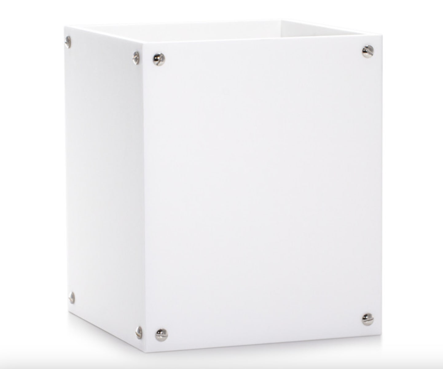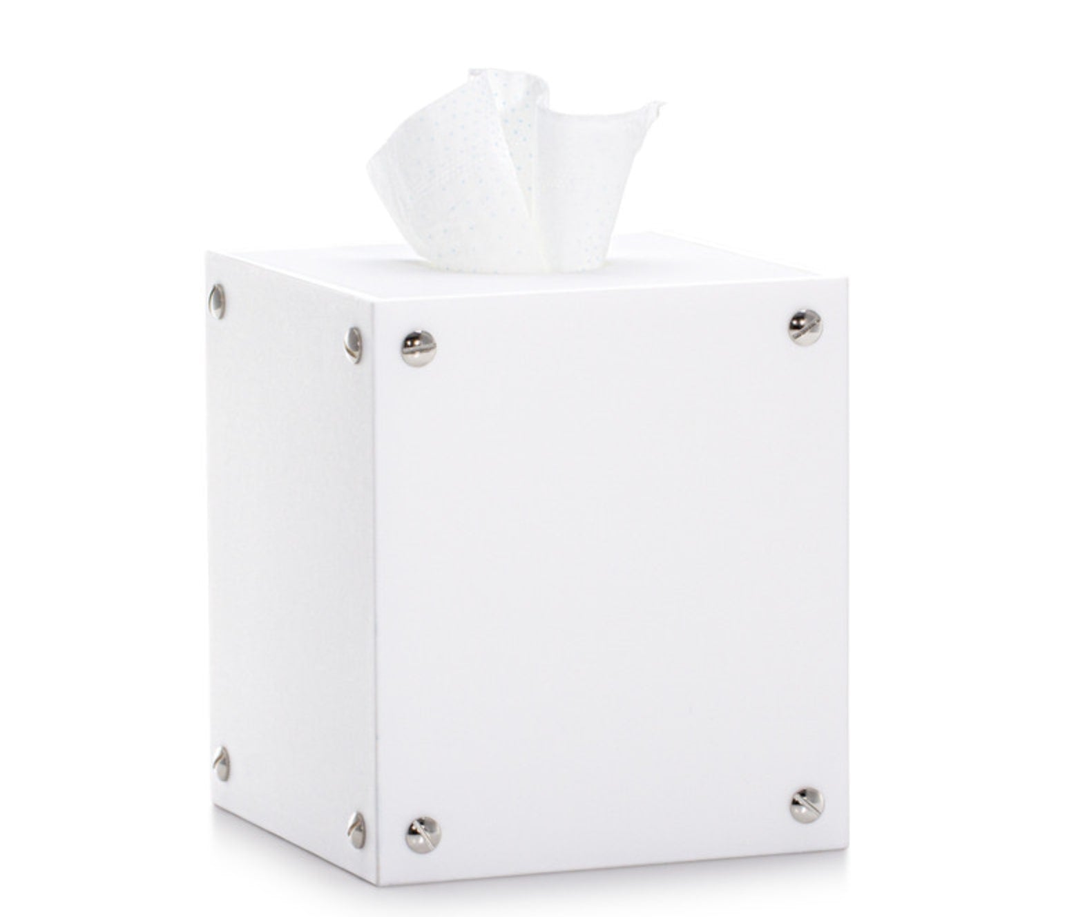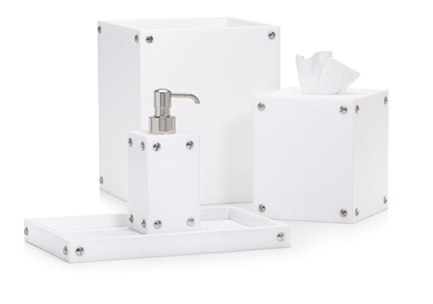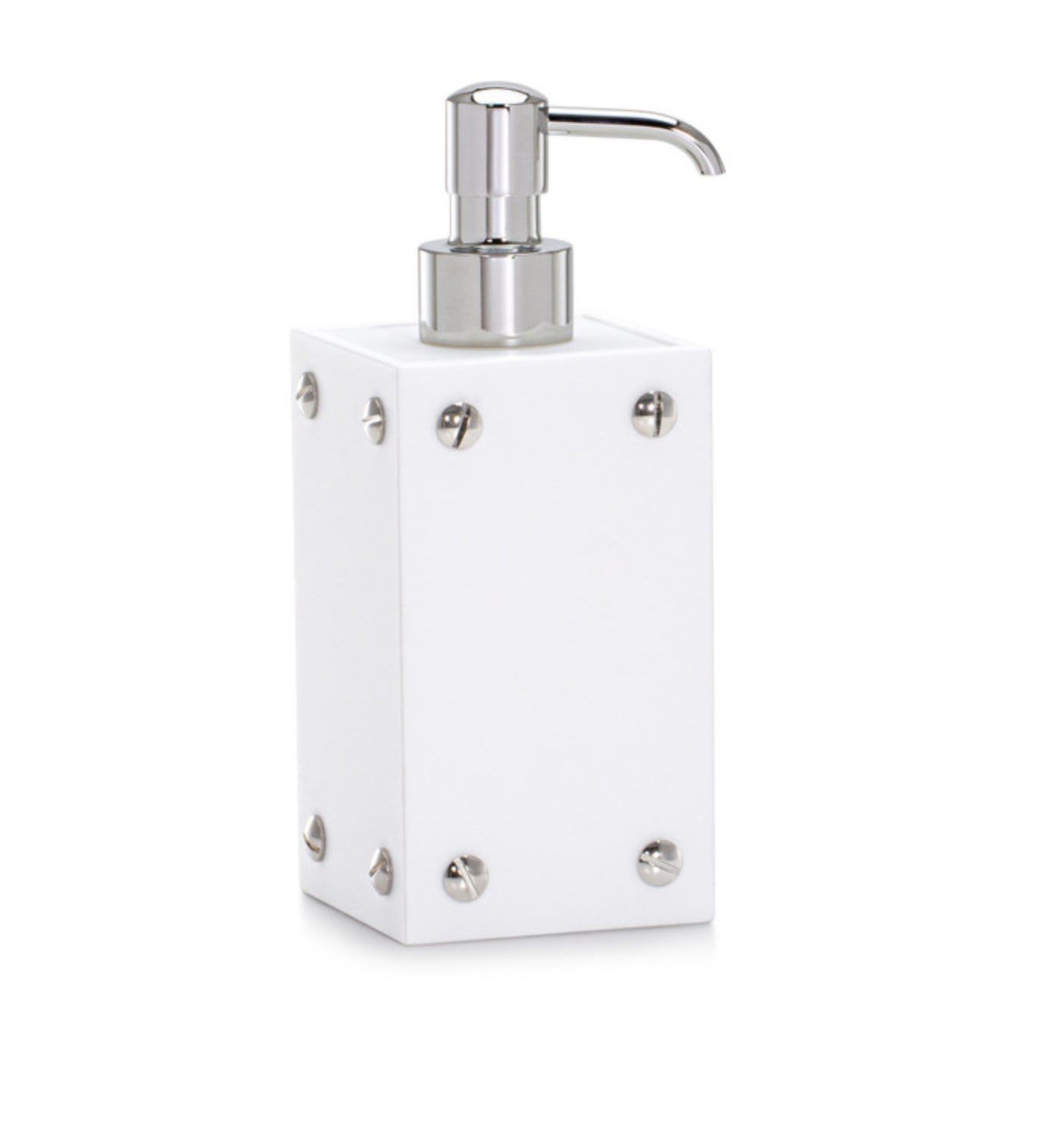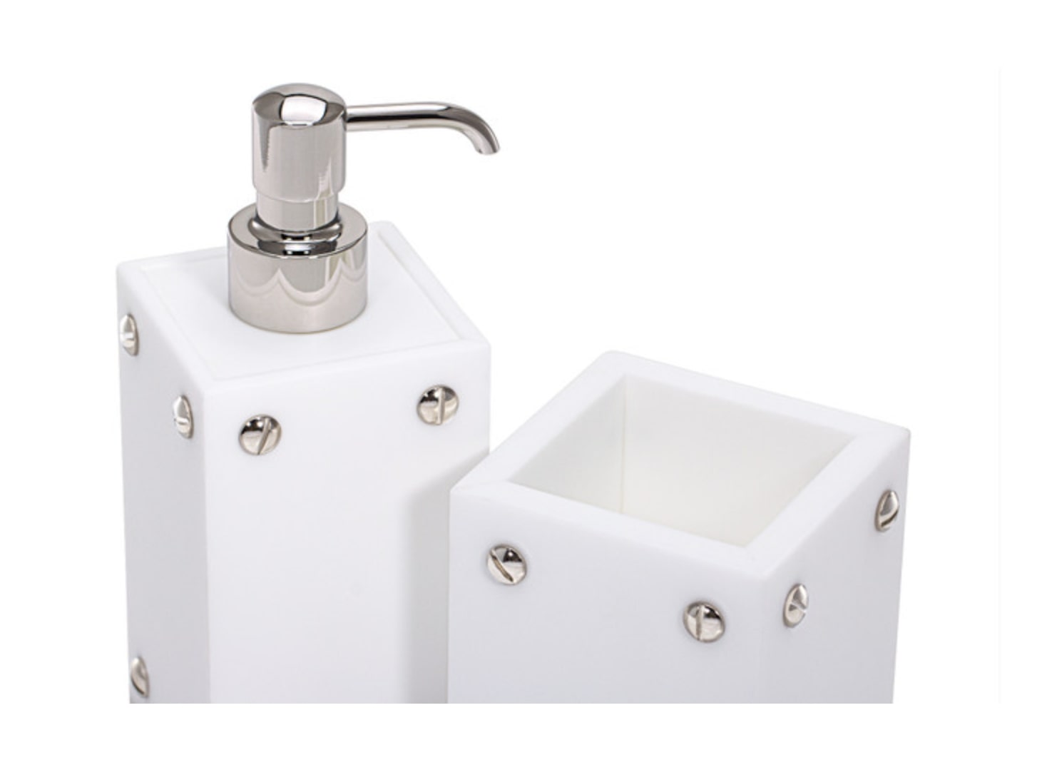 Elevate your bathroom with this striking vanity set that seamlessly blends contemporary design with industrial elements. Each piece features pristine white resin construction paired with a refined satin finish, delivering both visual elegance and substantial quality. Chrome-plated brass accents with decorative screw details grace the corners, adding a polished metallic contrast. Expertly crafted in Italy, this collection brings European sophistication to your daily routine.