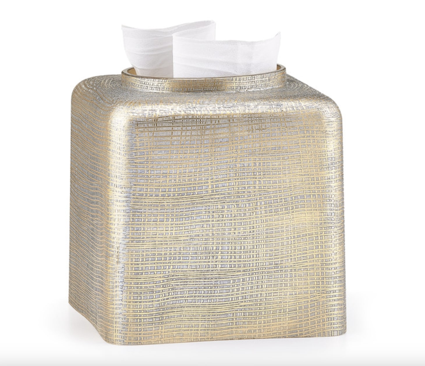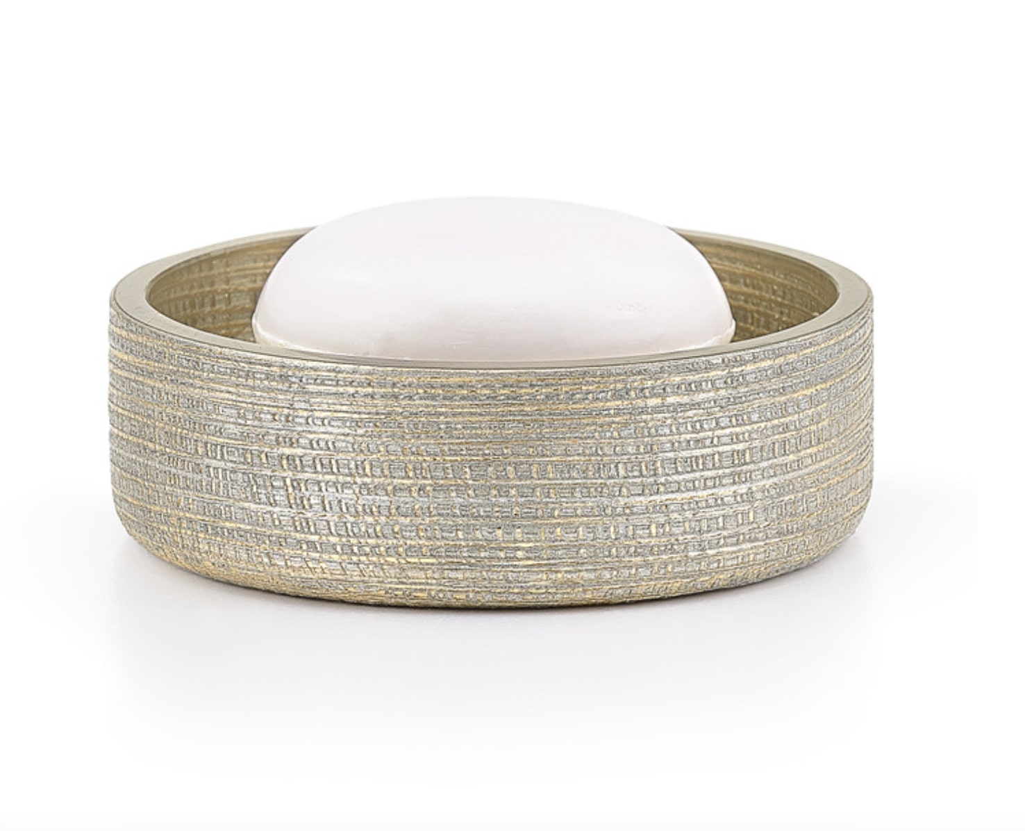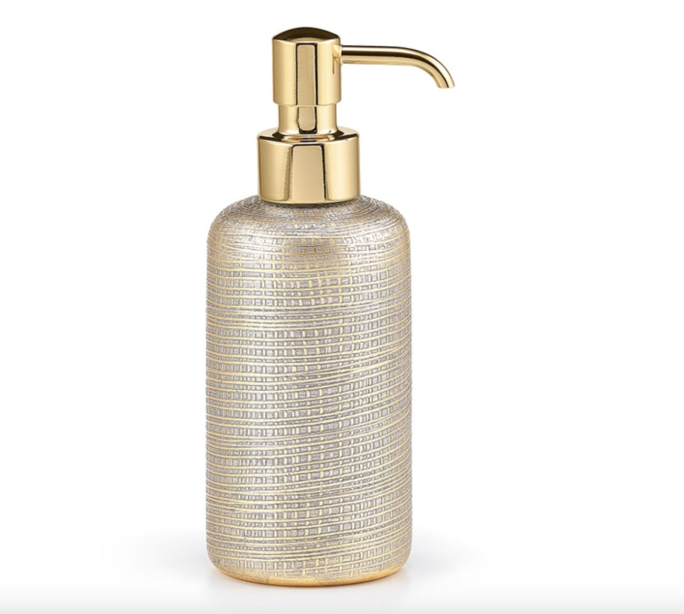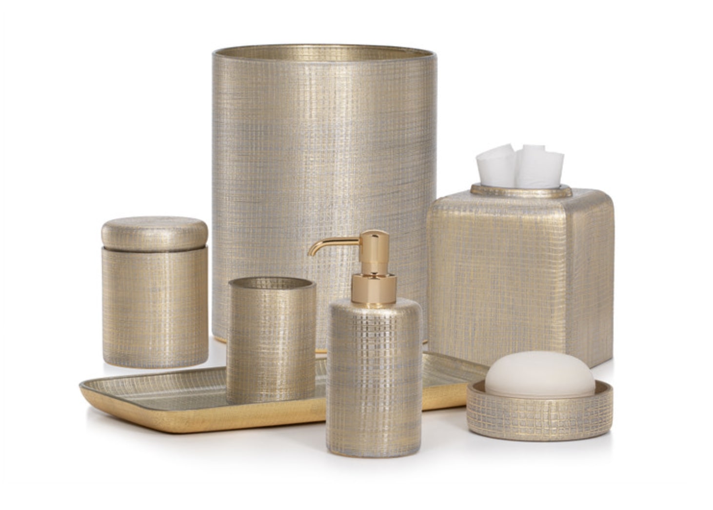 Crafted in Italy, this exquisite bath vanity collection merges lustrous gold and silver tones across hand-blown glass surfaces. Each piece showcases artisanal metallic enamel layers meticulously fired to create an elegant woven texture. The sophisticated interplay of precious metals and refined craftsmanship elevates any bathroom aesthetic. As with all handcrafted items, occasional air bubbles may naturally occur within the glass—a testament to its authentic, artisanal origin rather than an imperfection. Please note the brush holder pictured is no longer included.