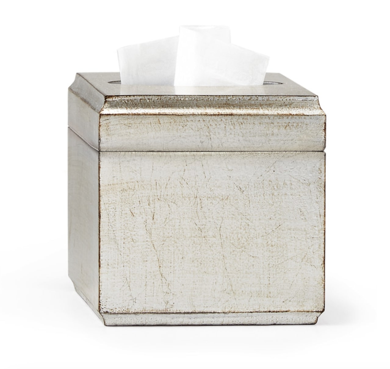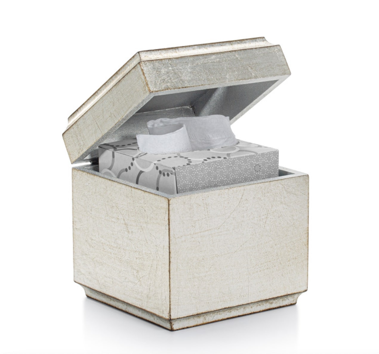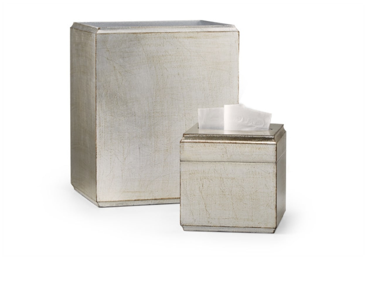 Elevate your bathroom with this refined silver vanity set from LaBrazel, meticulously crafted in Florence using authentic silver leaf. Each coordinated piece—tissue box and wastebasket—features an antique-glazed finish that exudes timeless elegance. A protective acrylic layer preserves the lustrous surface, while the tissue cover's hinged-lid design combines functionality with sophisticated style. Proudly made in Italy, this collection brings European craftsmanship to your daily routine.